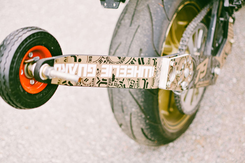 increases confidence by reducing your risk. The Wheelie Guard is NOT a cheat wheel. Its adjustable design allows the rear wheel to hover just slightly above the ground while practicing your wheelies. It is a safety net that prevents you from flipping backwards. Once the wheelie guard hits the ground and saves you from a potential fall, it increases your confidence. Which in turn will allow for quicker skill progression and increased experimentation on your motorcycle.